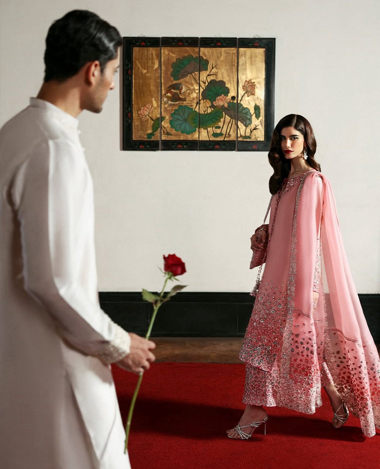 Blush pink raw silk shirt featuring intricate floral embroidery in soft gradient tones, delicately accented with silver sequins and hand embellishments. Fitted sleeves mirror the shirt’s floral detailing for a seamless finish. Paired with matching raw silk culottes adorned with complementing embellishments, and a pure organza dupatta embroidered along all four sides in fine floral motifs.