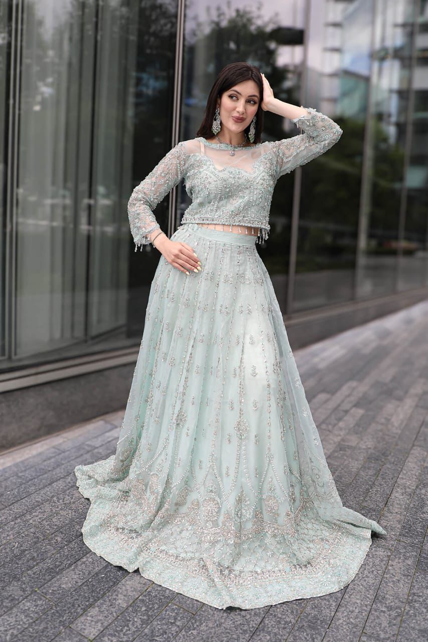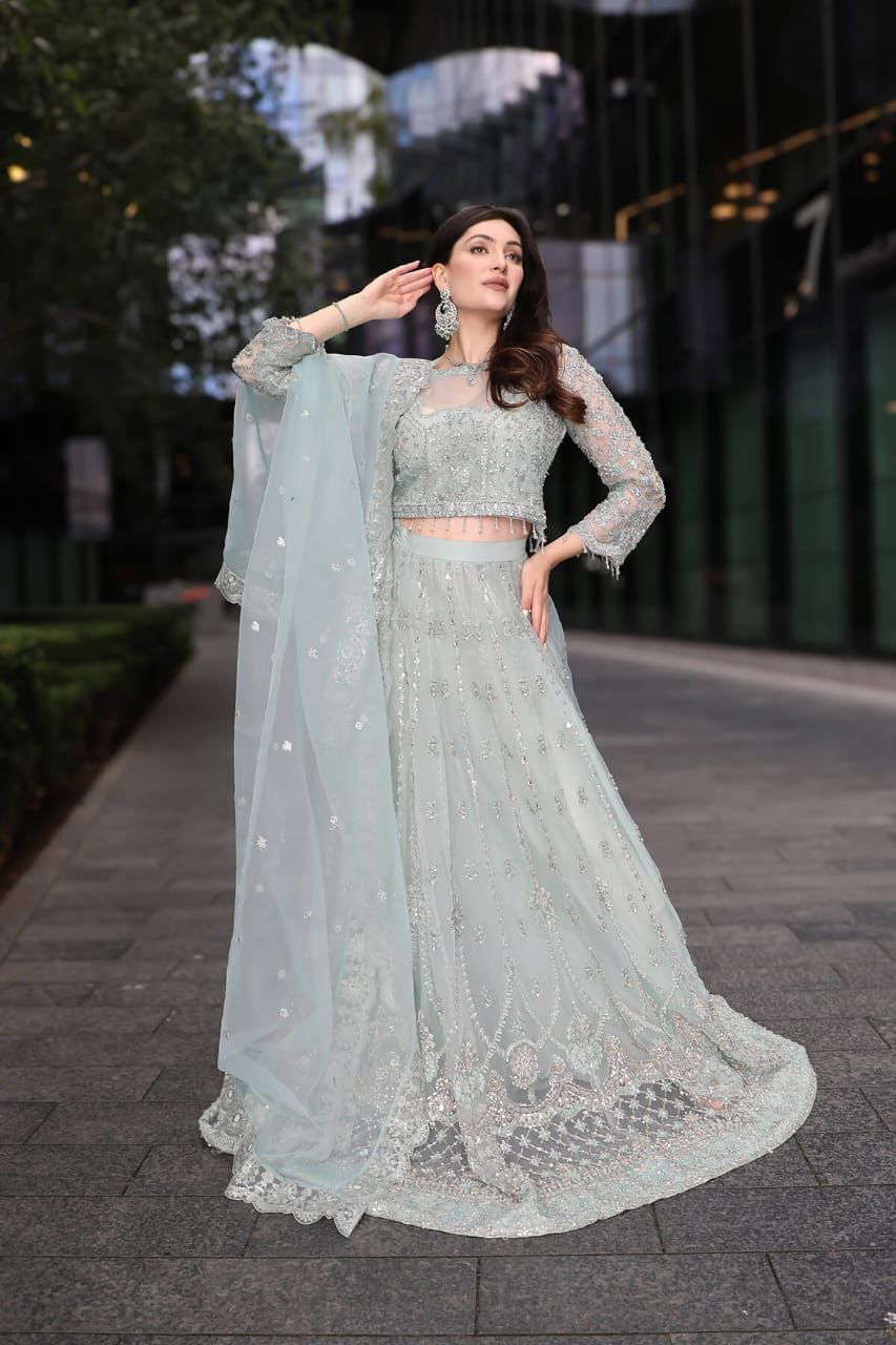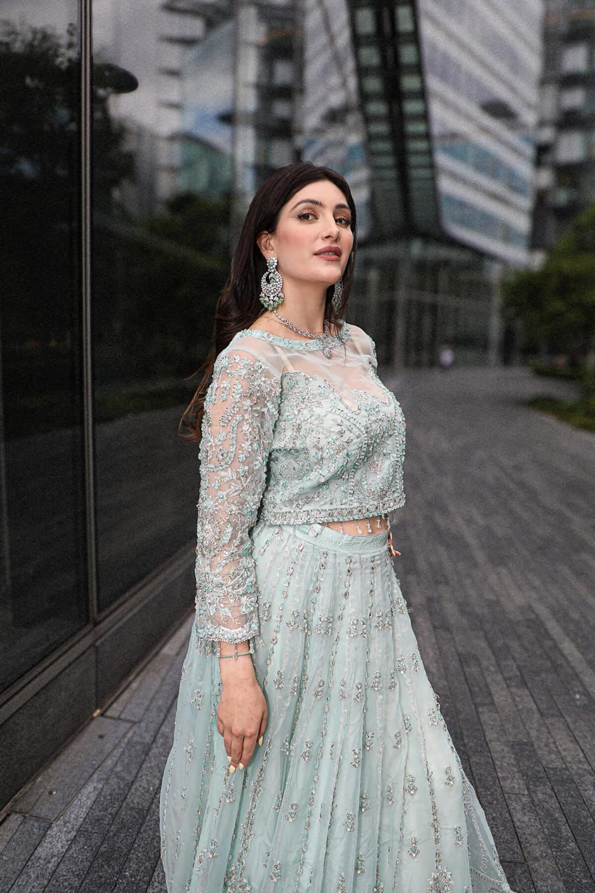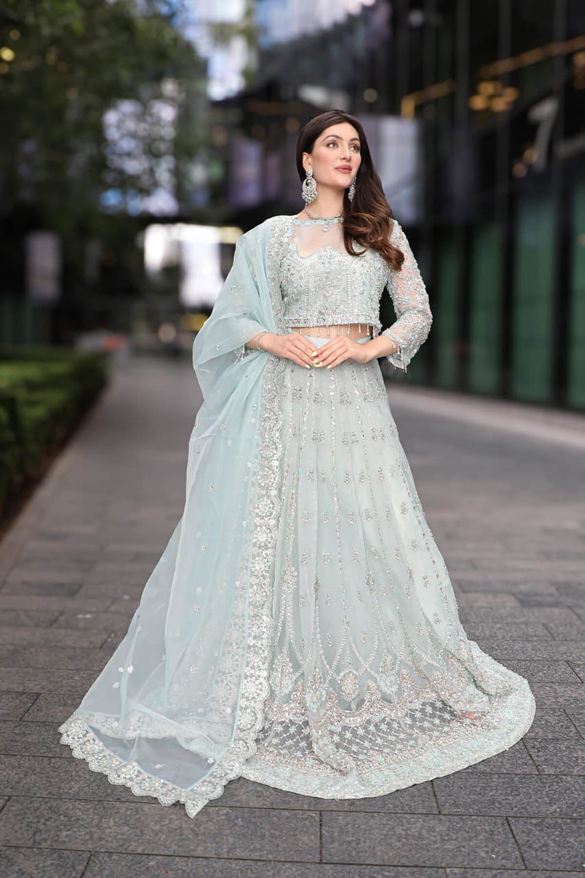 Step into celestial elegance with this enchanting ensemble — rendered in a refreshing aqua hue and adorned with dazzling hand embellishments. The ethereal silhouette, draped in layers of embroidered organza and delicate artistry, radiates sophistication and grace, making it an exquisite choice for weddings, festive soirées, and regal celebrations. Every intricate detail speaks of timeless grandeur — designed for the woman who embodies modern royalty.