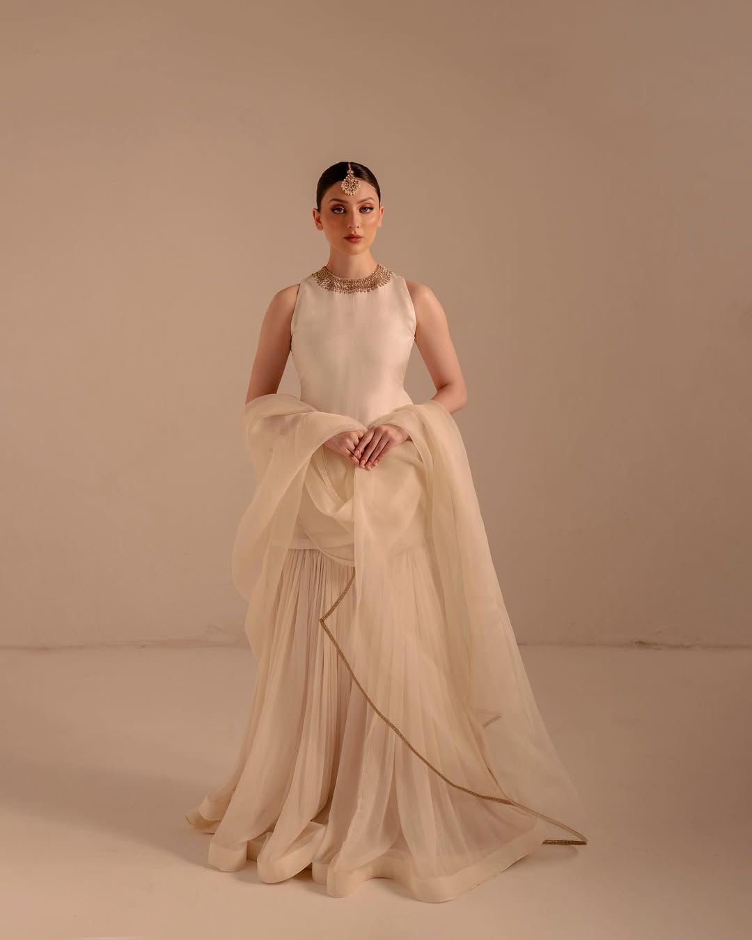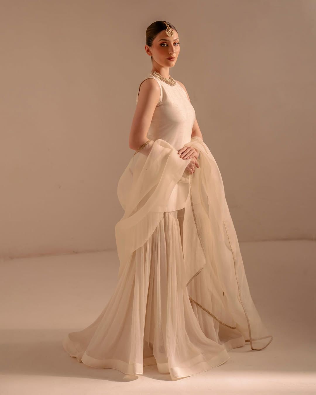 Luxurious ivory silk sharara set with gold embroidery featuring the finest tilla detailing and zardozi embroidery. Comes with its embroidered dupatta