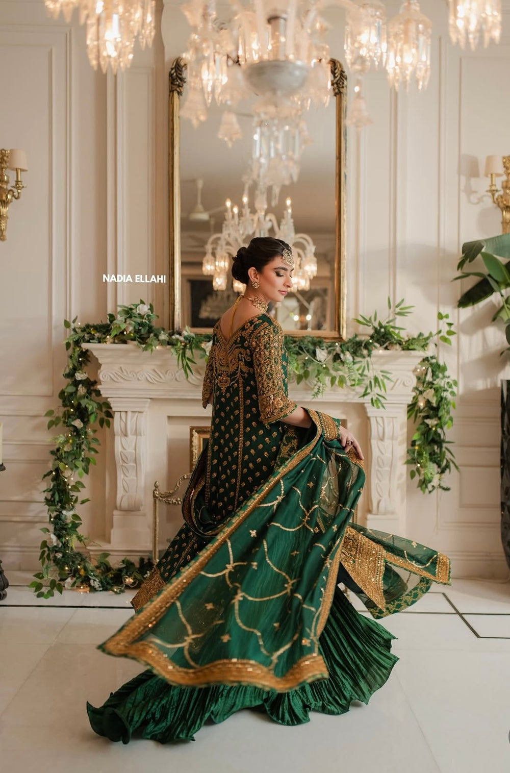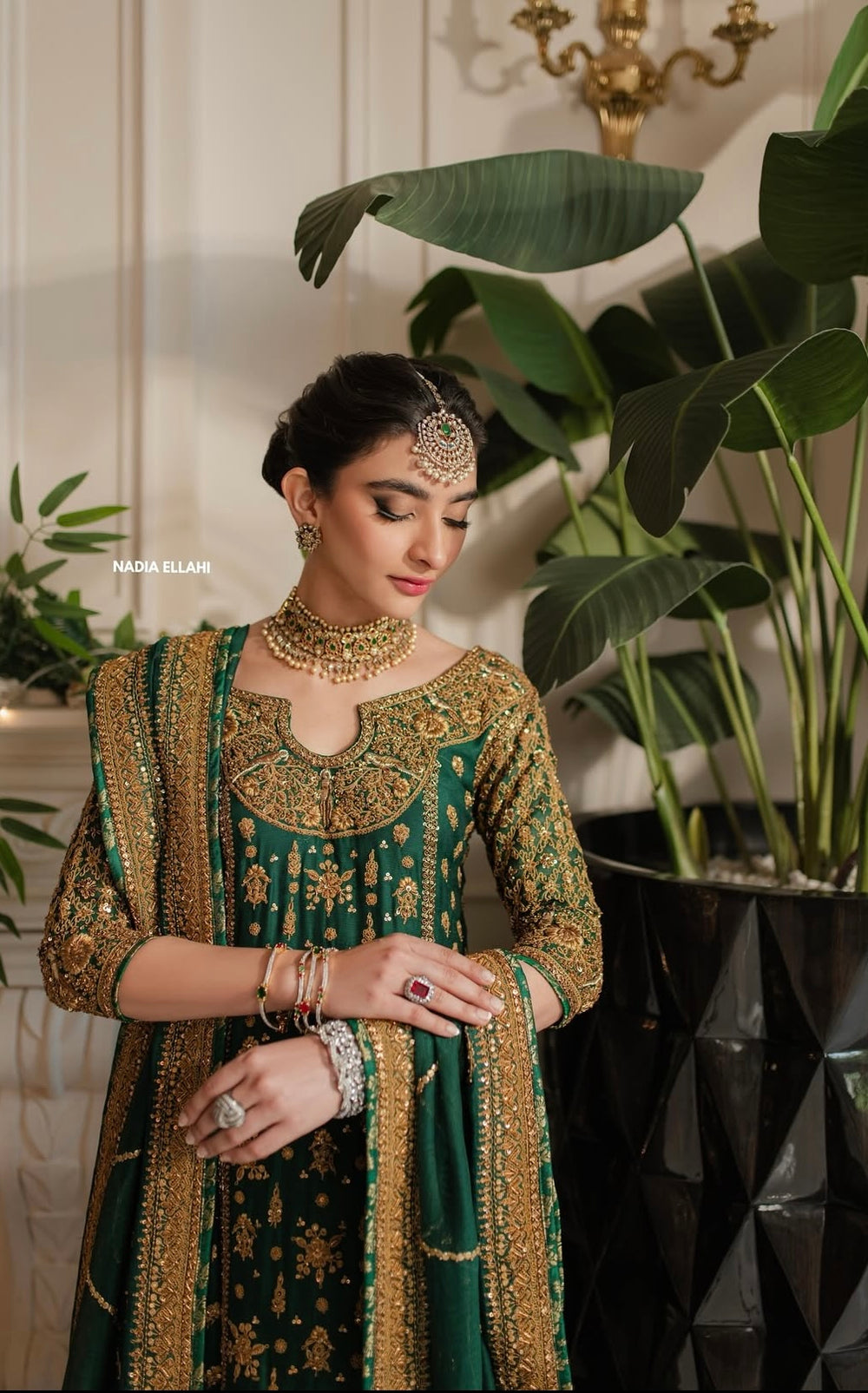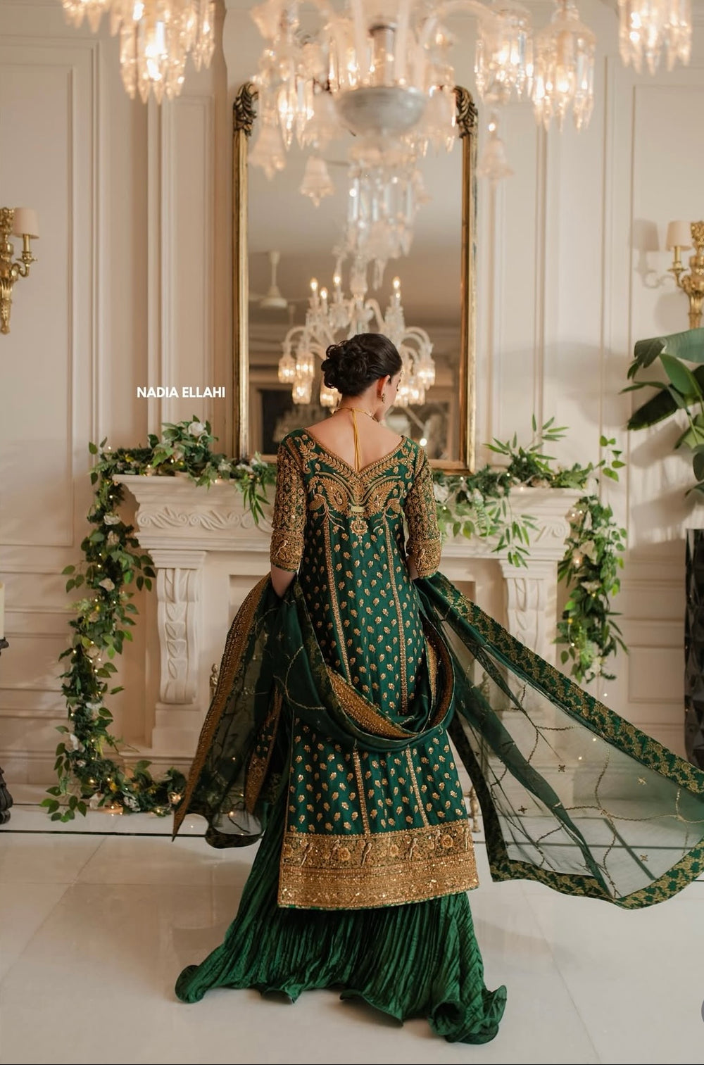 Mehrunissa by Nadia Ellahi” is an opulent ensemble that embodies regal charm and timeless sophistication. Designed with meticulous attention to detail, it features exquisite hand embroidery, intricate embellishments, and luxurious fabrics that drape gracefully. The ensemble’s rich color palette and delicate craftsmanship reflect a perfect fusion of tradition and modern elegance, making it an ideal choice for those who seek refinement and grandeur.